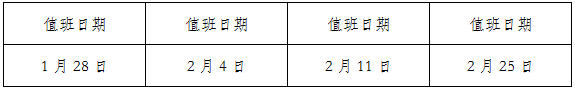 一、1月22日至2月26日期间,每周周三上午8:30至12:00安排专人值班,为校内外师生、校友及相关社会单位提供档案查询利用服务。2月27日起恢复正常上班时间。具体日期如下: