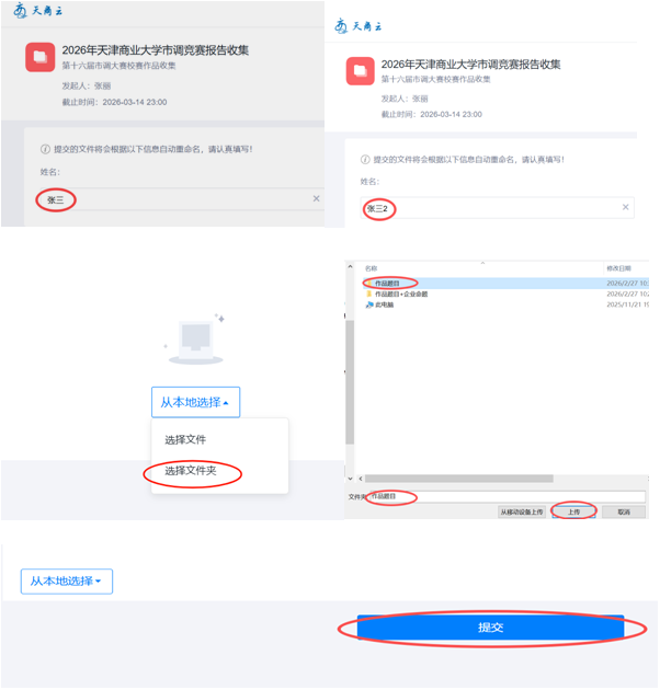 https://box.tjcu.ibixiu.com/collection/81b046a38d3be4fcb58951476c9429b1,姓名处填写队长姓名(提交后队长姓名不可更改),从本地点击选择文件夹后,点击“提交”。